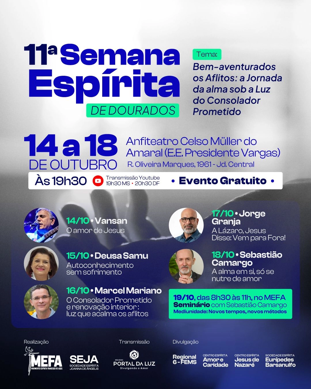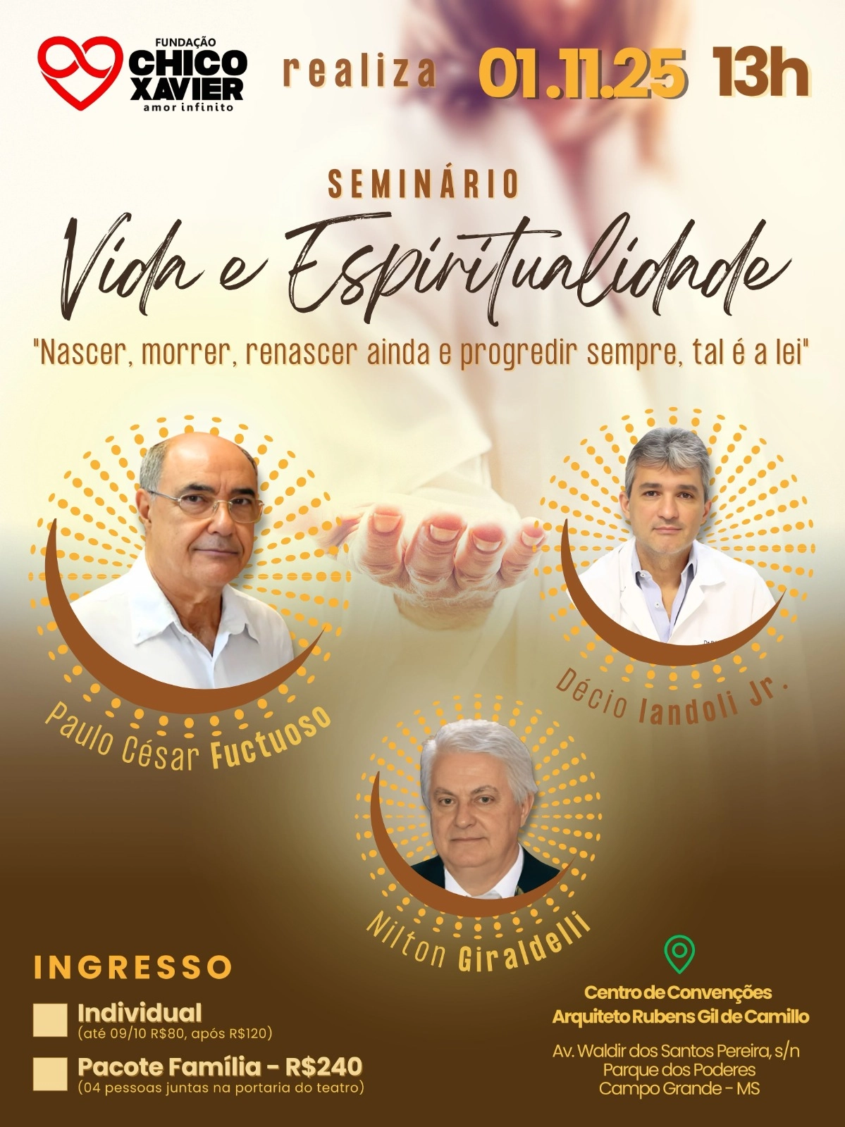 Seminário VIDA E ESPIRITUALIDADE no dia 01/11/25 no Palácio Popular da Cultura em Campo Grande - MS Evento da FCX - Fundação Chico Xavier
