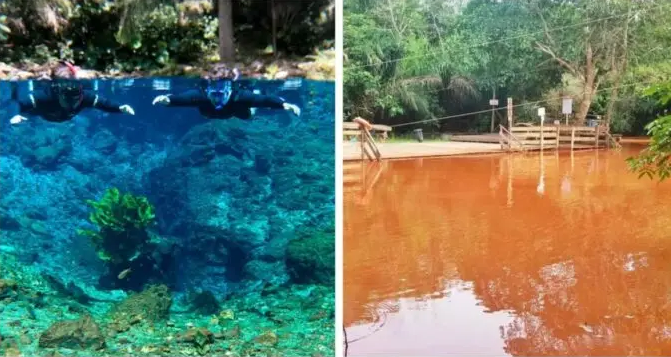 Depois das chuvas, as águas ficam opacas, leitosas e até barrentas, demorando para limpar, segundo relatos de moradores e guias de turismo locais.