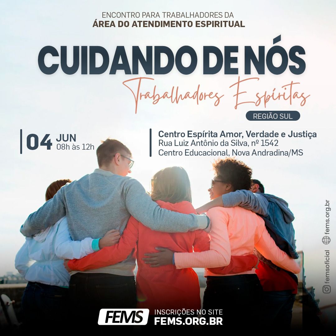 ➡ A Formação será presencial, em Nova Andradina, no dia 04 de junho, das 08h às 12h e se destina ao trabalhadores espíritas da Região Sul do estado.