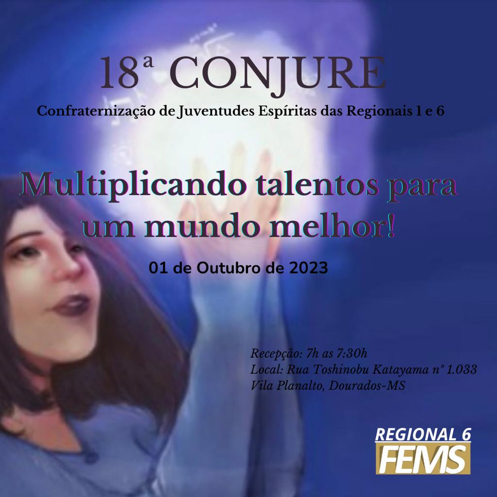 ???? Em 01/10, teremos a *XVIII CONJURE - Confraternização de Juventudes Espíritas da URE/Regionais 1 e 6*, com programação na manhã e tarde de domingo, a partir das 7h, na Rua Toshinobu Katayama, 1033, Vila Planalto, em Dourados-MS.