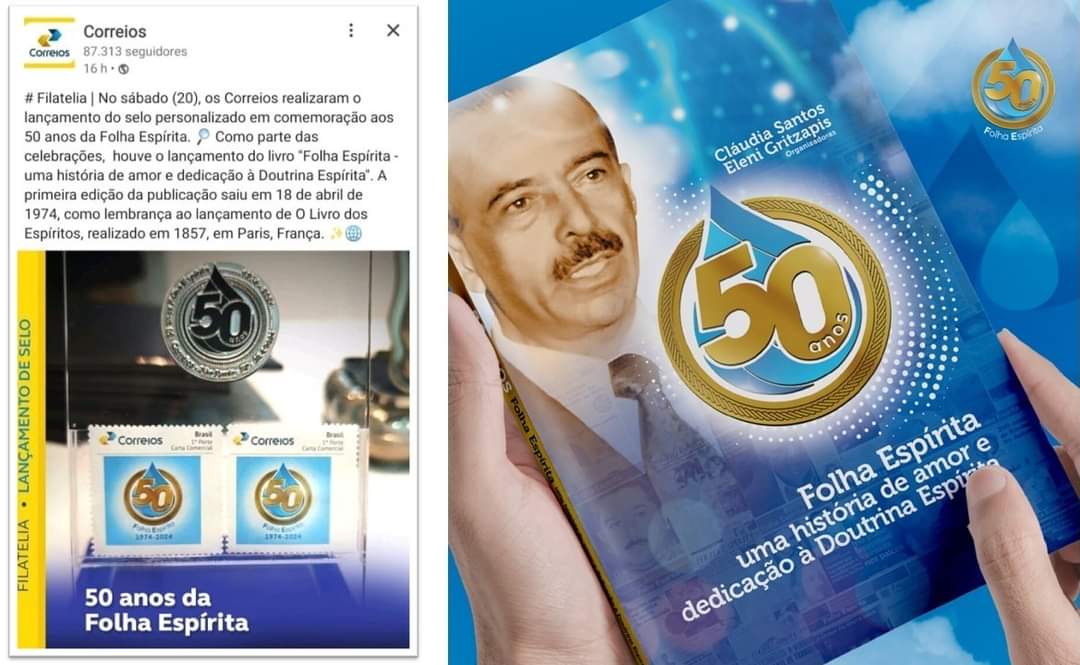 Selo dos Correios e livro sobre os 50 anos da "Folha Espírita"