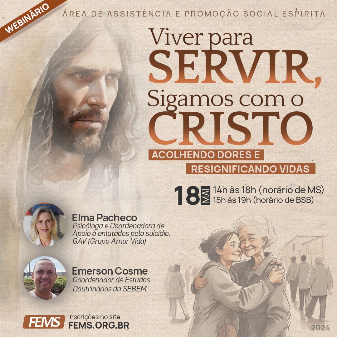 ???? “_Viver para Servir, sigamos com o Cristo_”, é a proposta do webinário promovido pela Área de Assistência e Promoção Social Espírita, que visa a qualificação sistêmica do trabalhador do Centro Espírita para o devido acolhimento daqueles que o procuram motivados pela perda de entes queridos. Dessa forma, o tema *“Acolhendo dores e resignificando vidas”* trará reflexões valiosas para todos.