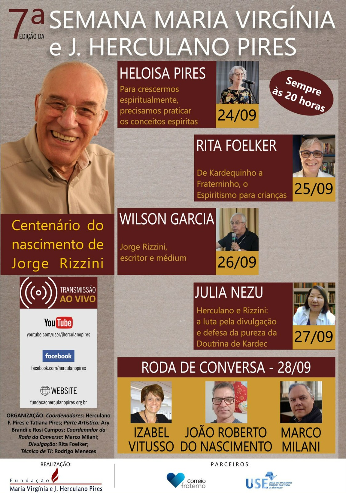 De 24 a 28 de Setembro de 2024, a Fundação Maria Virgínia e José Herculano Pires, promove a 7ª. Semana Maria Virgínia e J. Herculano Pires. O evento deste ano relembra o centenário de nascimento de Jorge Rizzini, escritor, médium, amigo e companheiro espírita de Herculano Pires durante décadas.