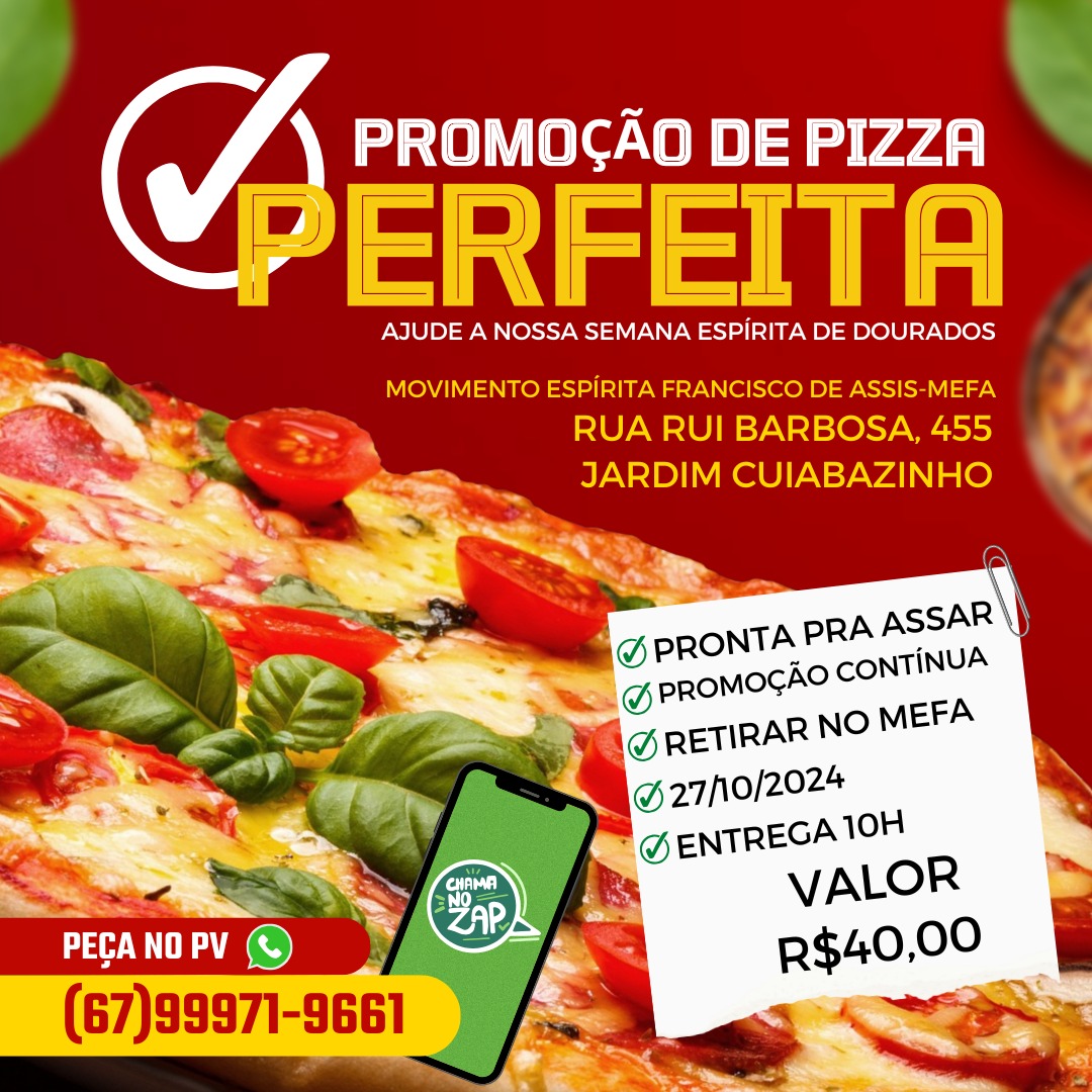 PROMOÇÃO PIZZA PERFEITA - AJUDE A NOSSA SEMANA ESPÍRITA DE DOURADOS - VALOR R$ 40 REAIS, RETIRADA DATA: 27/10/24 - À PARTIR DAS 10H