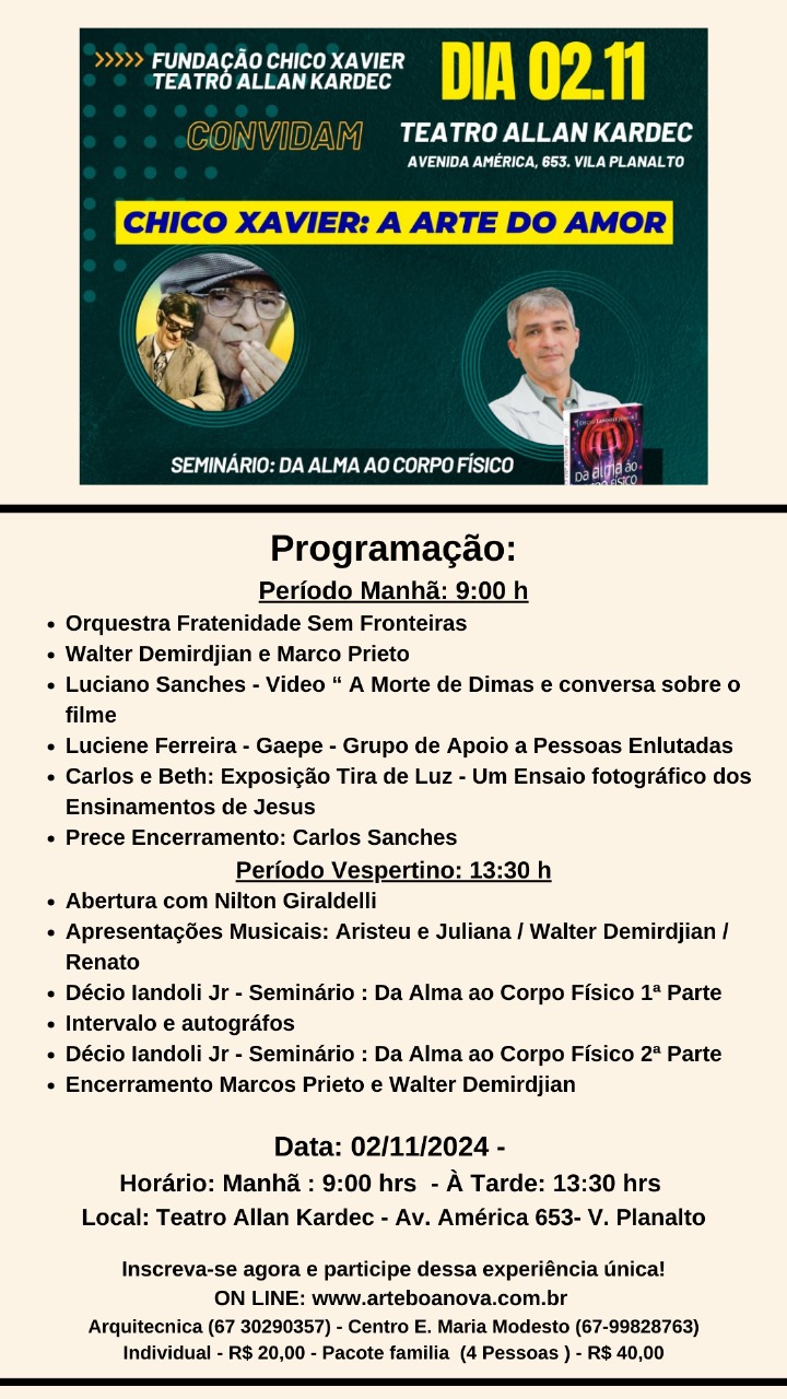 Contamos com a sua participação imprescindível neste seminário repleto de luz, reflexões e emoções nobres proporcionada pela convivência entre os amigos encarnados e desencarnados.