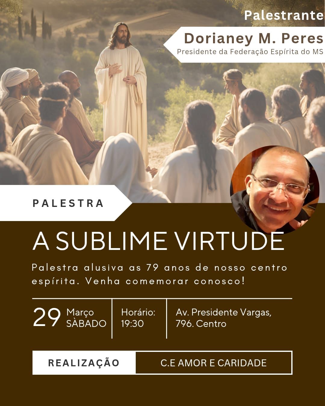 Palestra "A Sublime virtude " - que será realizada pelo sr. Dorianey M. Peres( Pres. da FEMS), alusiva aos 79 anos do CEAC -Centro Espírita Amor e Caridade de Dourados, a ser realizada dia 29/03/2025, às 19:30h, sito à Av. Presidente Vargas, 796- Centro - Dourados/Ms