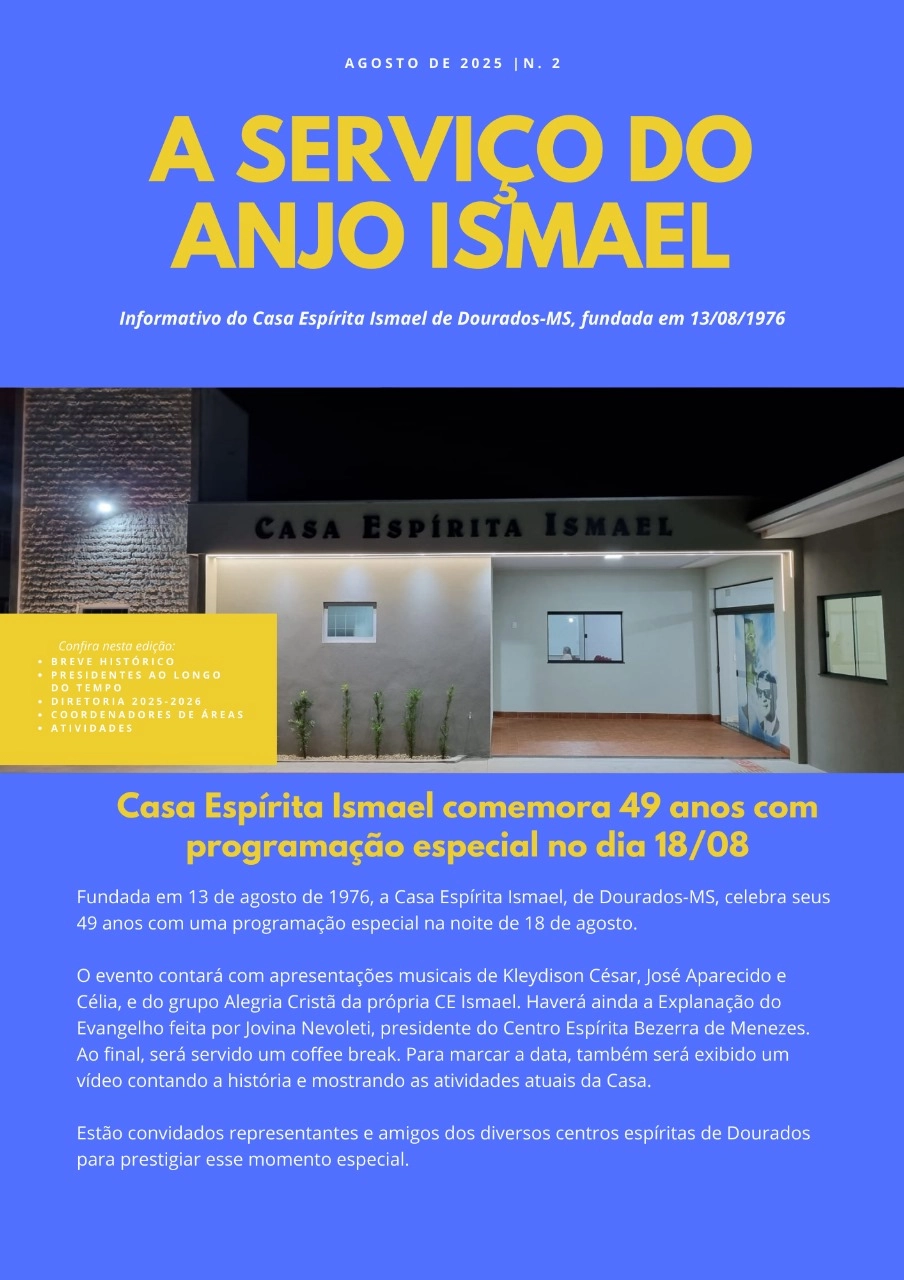 Fundada em 13 de agosto de 1976, a Casa Espírita Ismael, de Dourados-MS, celebra seus 49 anos com uma programação especial na noite de 18 de agosto.