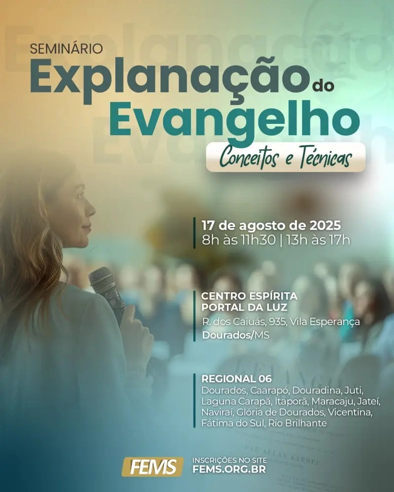 A Federação Espírita de Mato Grosso do Sul convida todos os trabalhadores da Regional 06 do nosso Estado — com ou sem experiência na exposição doutrinária — para o Seminário “Explanação do Evangelho – Conceito e técnicas de exposição”.