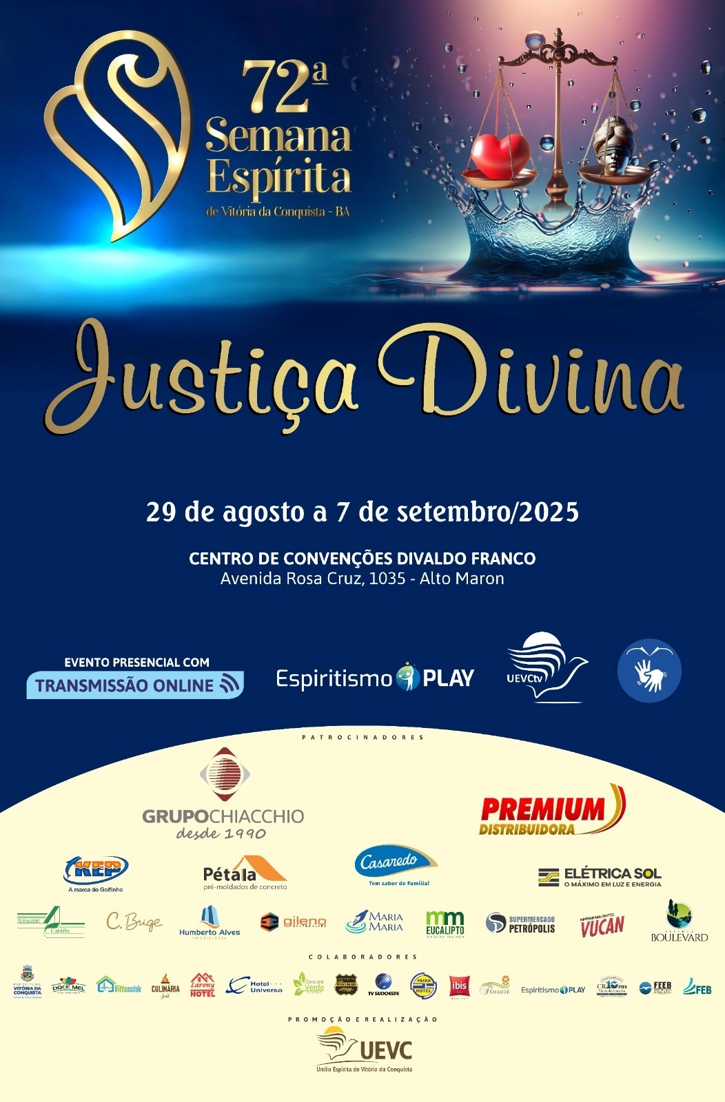 Nossa cidade sediará, do dia 29 de agosto a 07 de setembro de 2025, a 72ª Semana Espírita de Vitória da Conquista. Com o tema “A justiça divina”, o Centro de Convenções Divaldo Franco receberá, presencialmente, pessoas de várias partes do Brasil.