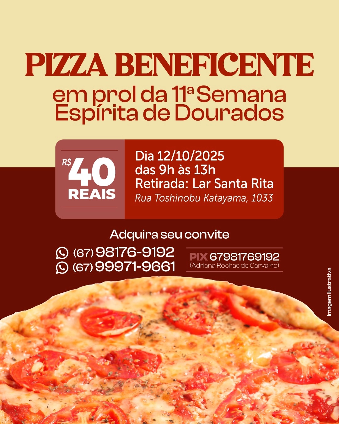 No dia 12 de outubro de 2025, garanta sua pizza e apoie a 11ª Semana Espírita de Dourados! Compre seu vale pizza e ajude a tornar possível um evento imperdível, que acontecerá de 14 a 18 de outubro, às 19h, no anfiteatro da EE Presidente Vargas.