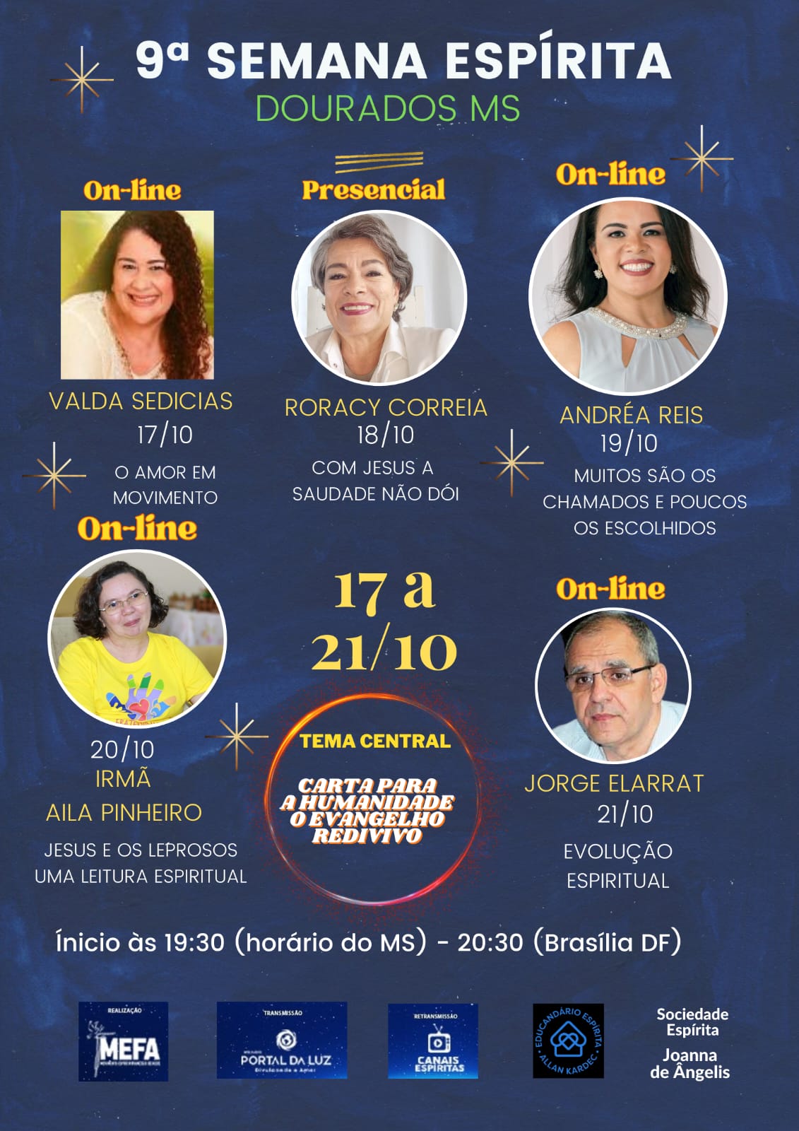 Todas as palestras, com exceção daquela a ser proferida por Roracy Correia, serão on-line e transmitidas pela Rádio Portal da Luz, a Rádio que divulga o Amor.