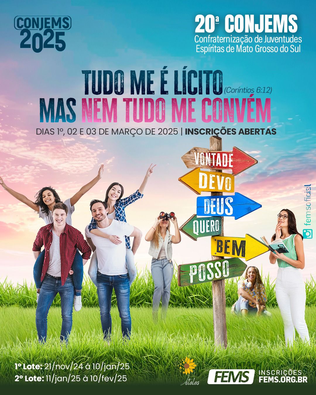 Acesse o site http://fems.org.br , baixe a ficha de inscrição e garanta a sua vaga na *20ª CONJEMS* (Confraternização de Juventudes Espíritas de Mato Grosso do Sul)