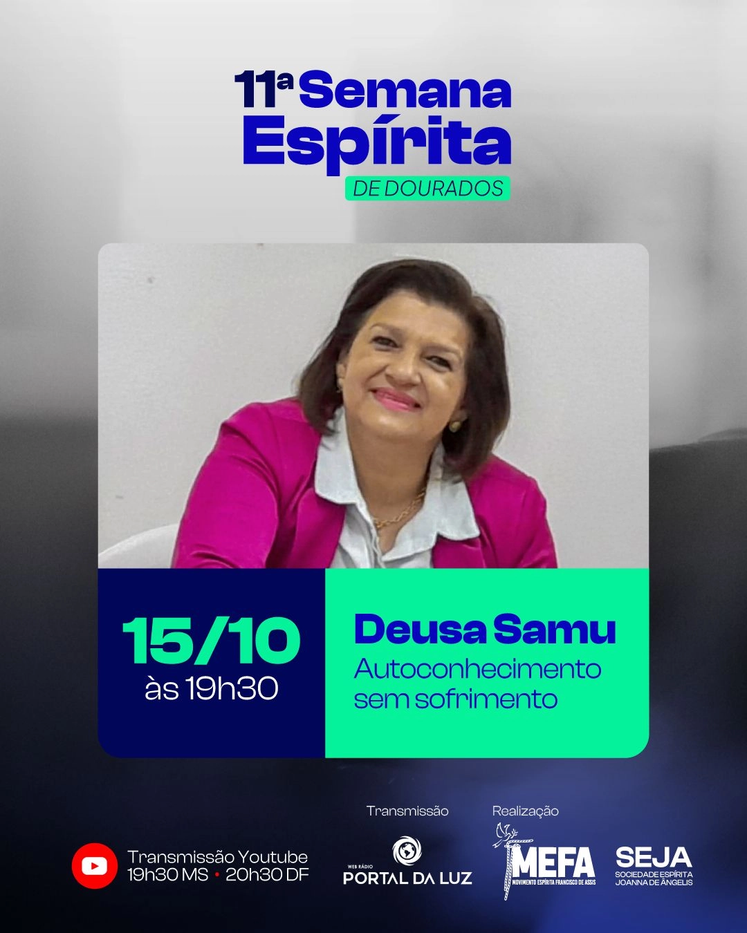 · Sejam todos muito bem-vindos à 11ª Semana Espírita de Dourados, um evento gratuito, presencial e online, promovido pelo Movimento Espírita Francisco de Assis – MEFA e pela Sociedade Espírita Joana de Angelis (SEJA), ambas sediadas aqui em Dourados.