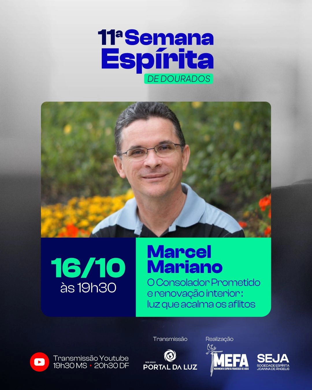 · Conhecido nacionalmente, Marcel Mariano é palestrante espírita que se destaca em eventos doutrinários e de educação espiritual por todo o país. Suas conferências abordam temas variados como crises, evangelização e as leis divinas, sempre com foco no desenvolvimento espiritual de crianças, jovens e adultos. Dedica sua vida à divulgação dos ensinamentos espíritas, sendo uma presença constante em eventos, vídeos e programas que promovem reflexão espiritual e a busca pelo autoconhecimento.